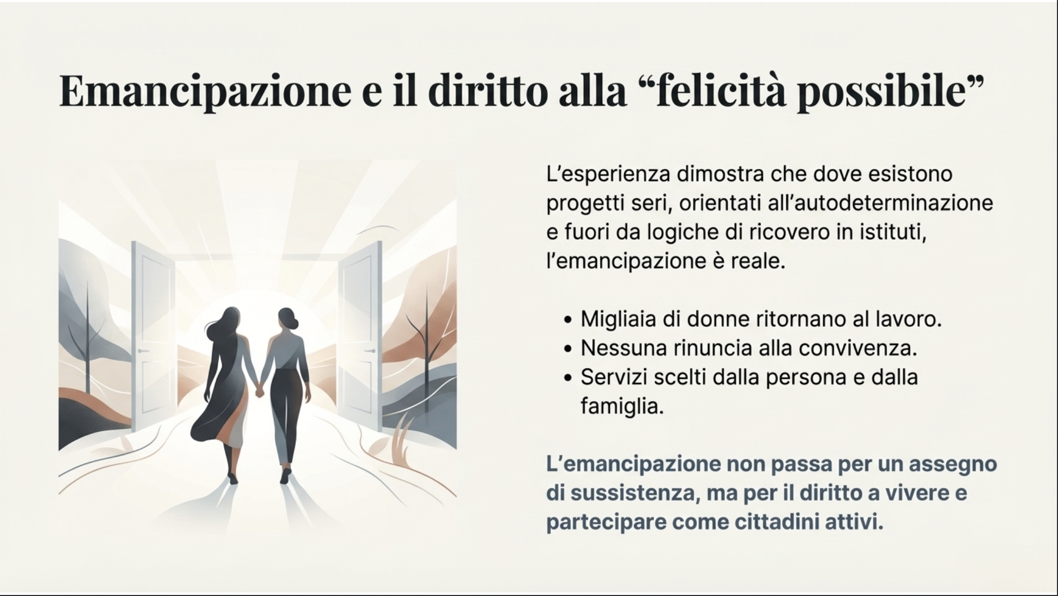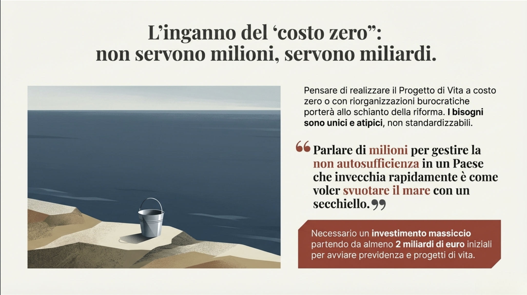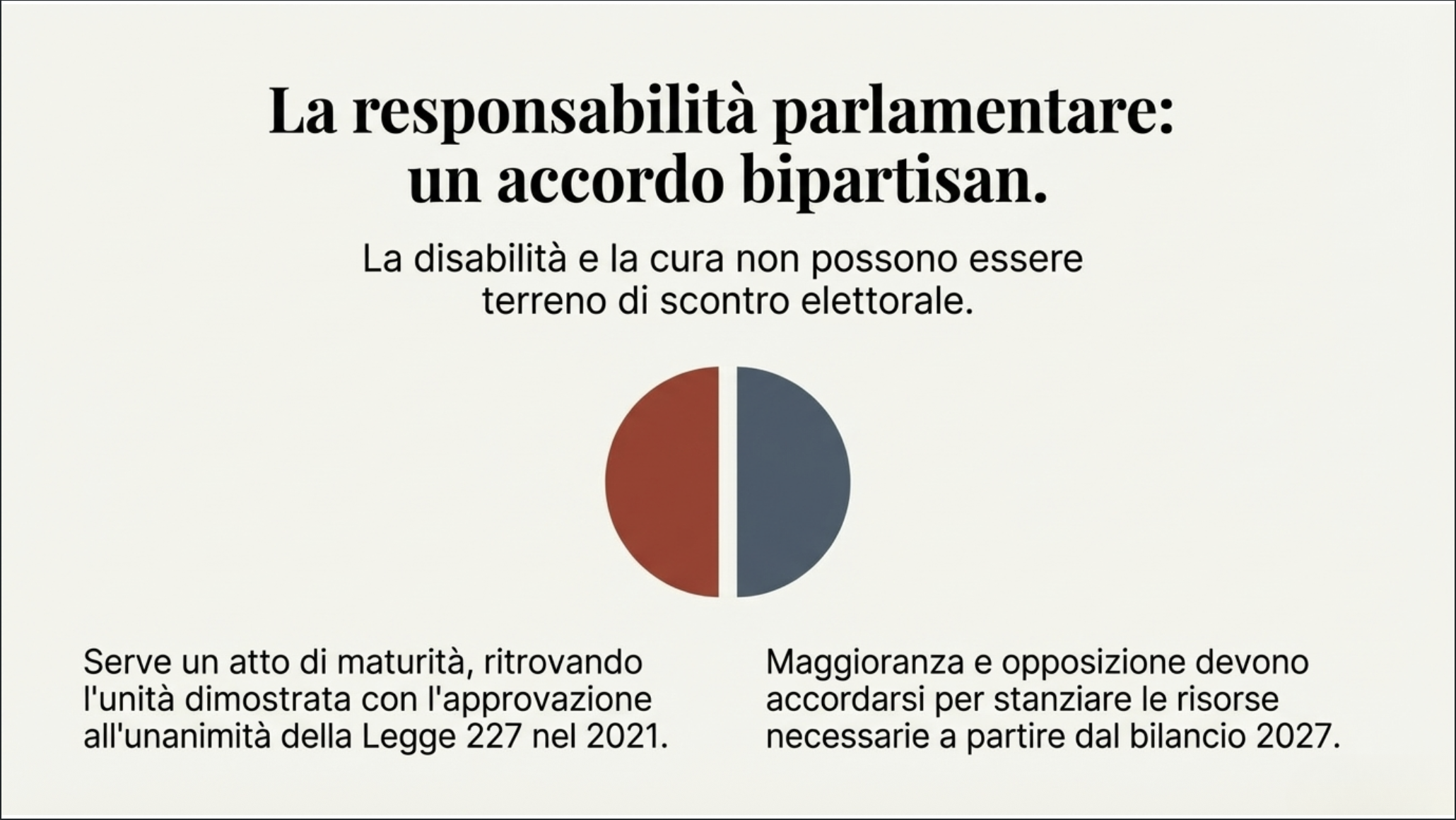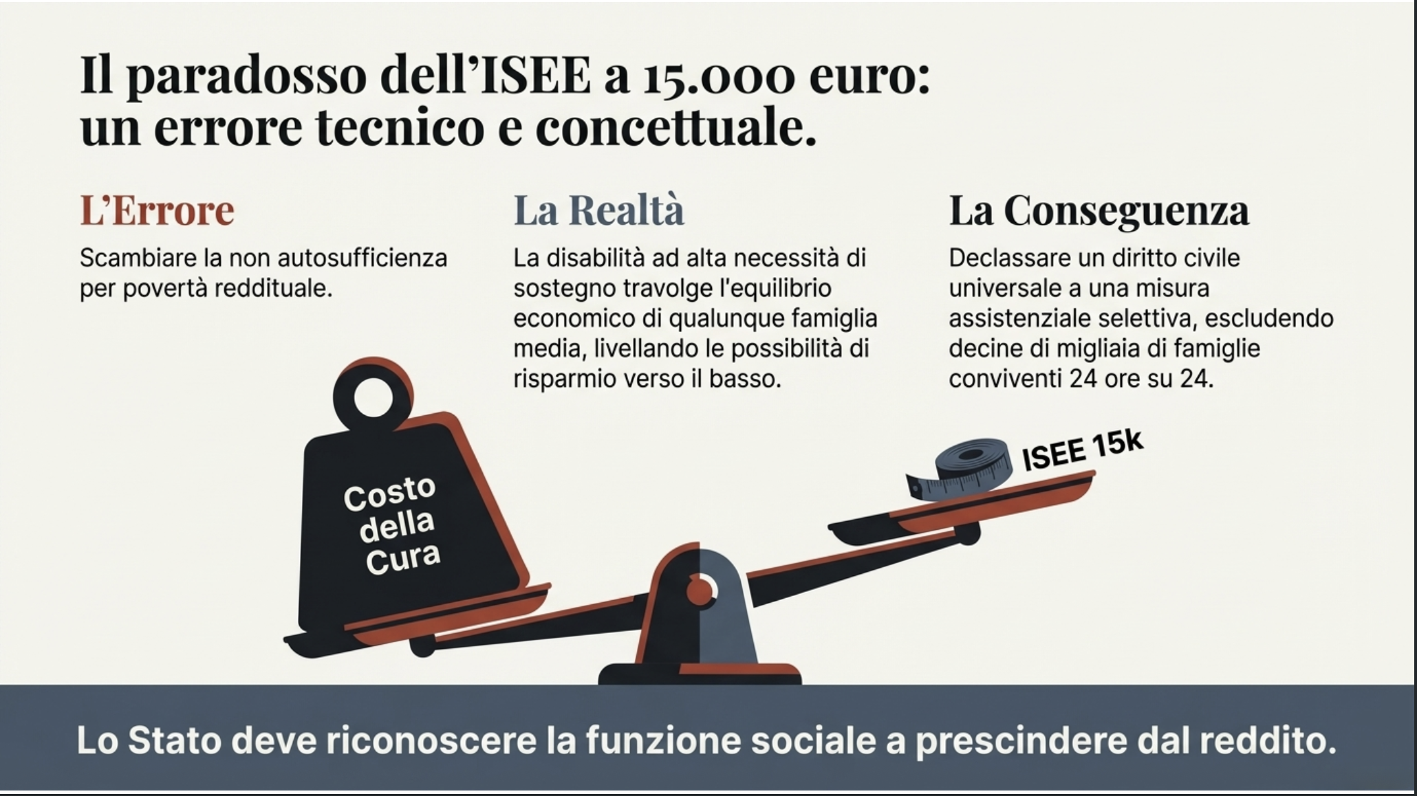 Critico anche il limite ISEE di 15.000 euro previsto dal DDL, che rischia di trasformare un diritto civile in una misura assistenziale selettiva. Per rendere i diritti realmente esigibili servono risorse strutturali: almeno due miliardi di euro iniziali, con l’obiettivo di arrivare a cinque miliardi negli anni.