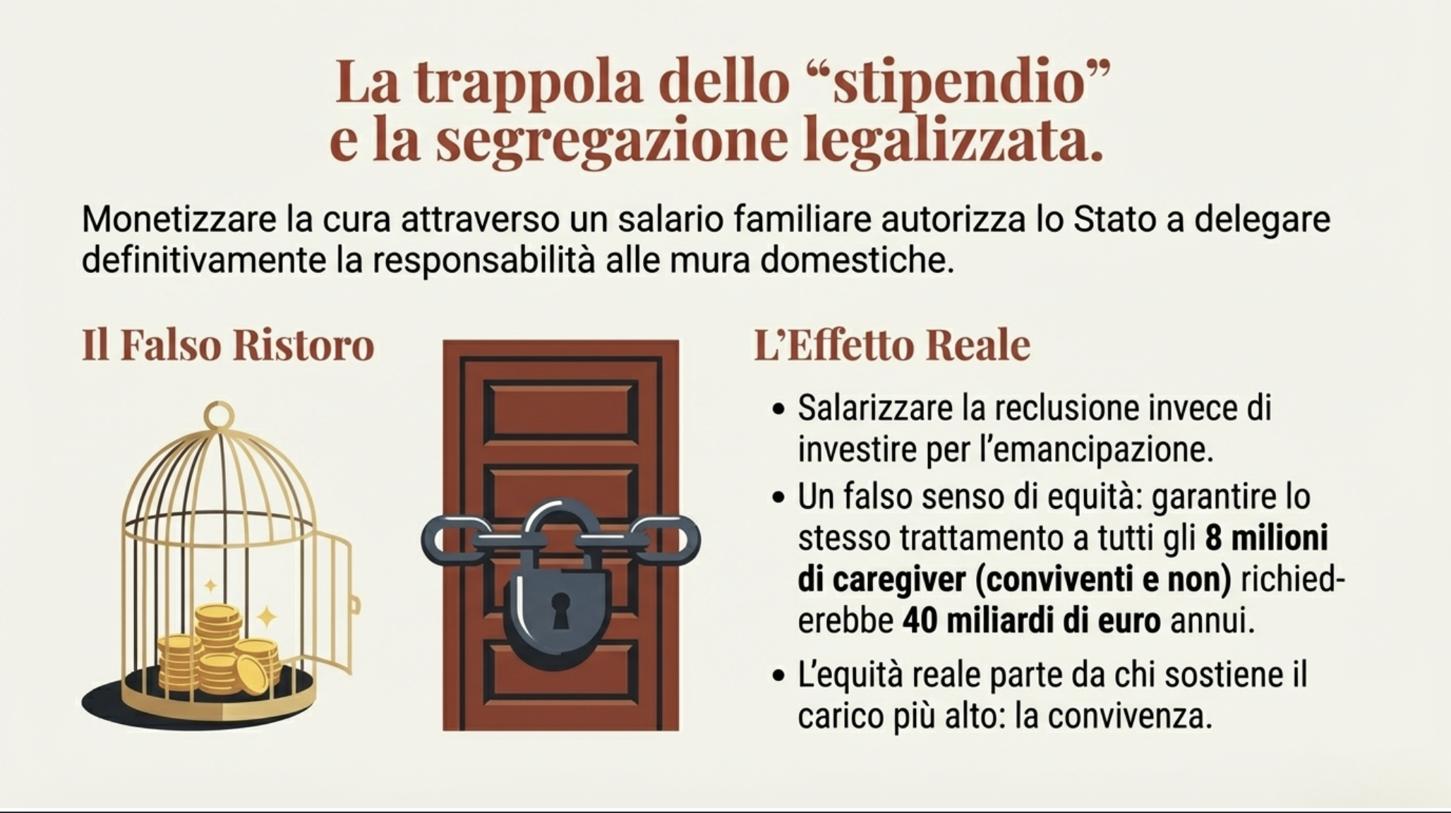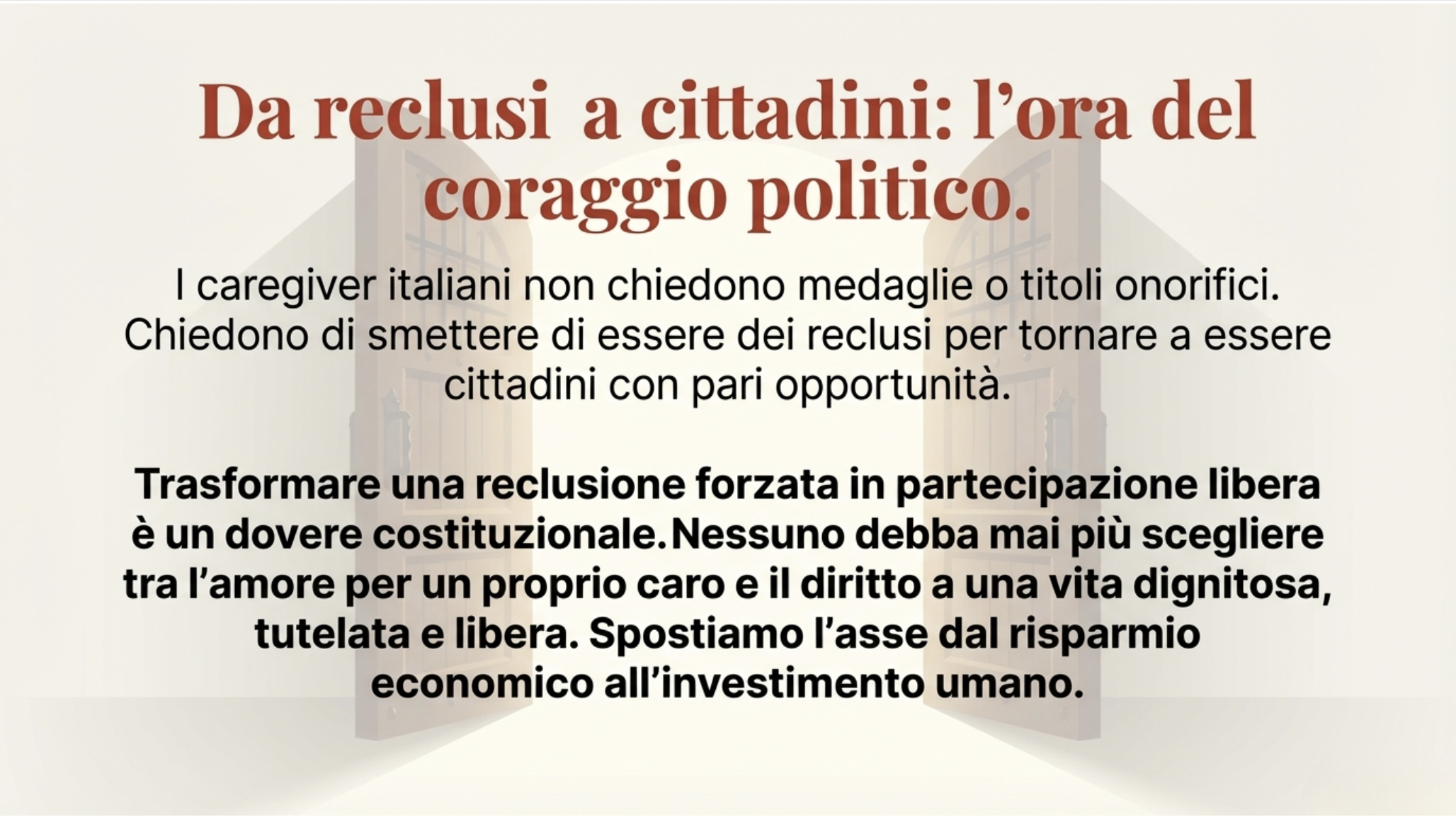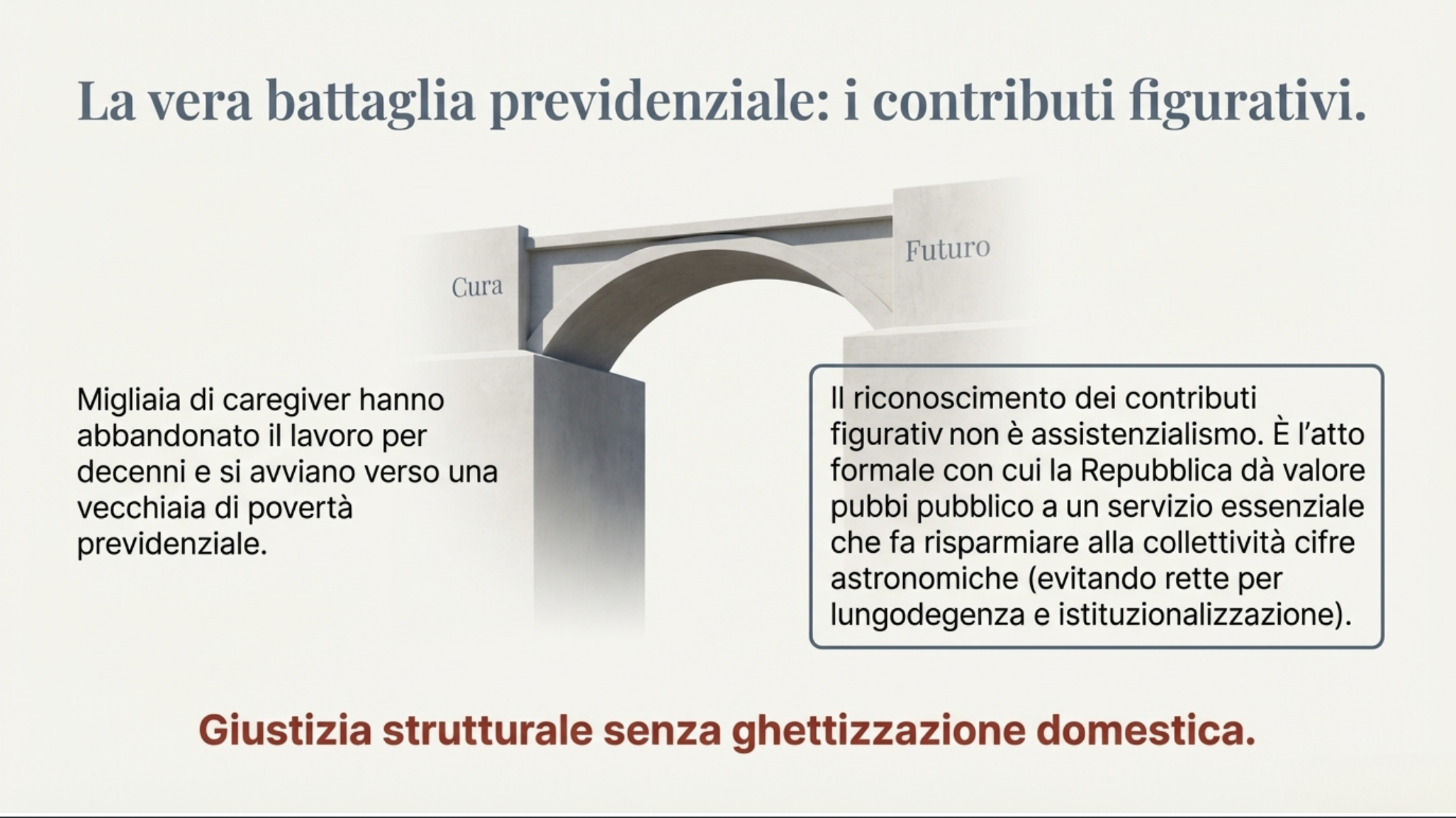 Oggi migliaia di persone, soprattutto donne, vivono una condizione di isolamento forzato per assistere i propri familiari non autosufficienti. La semplice monetizzazione della cura non è la soluzione: il vero riconoscimento deve essere previdenziale, attraverso contributi figurativi che valorizzino un lavoro essenziale per la collettività.