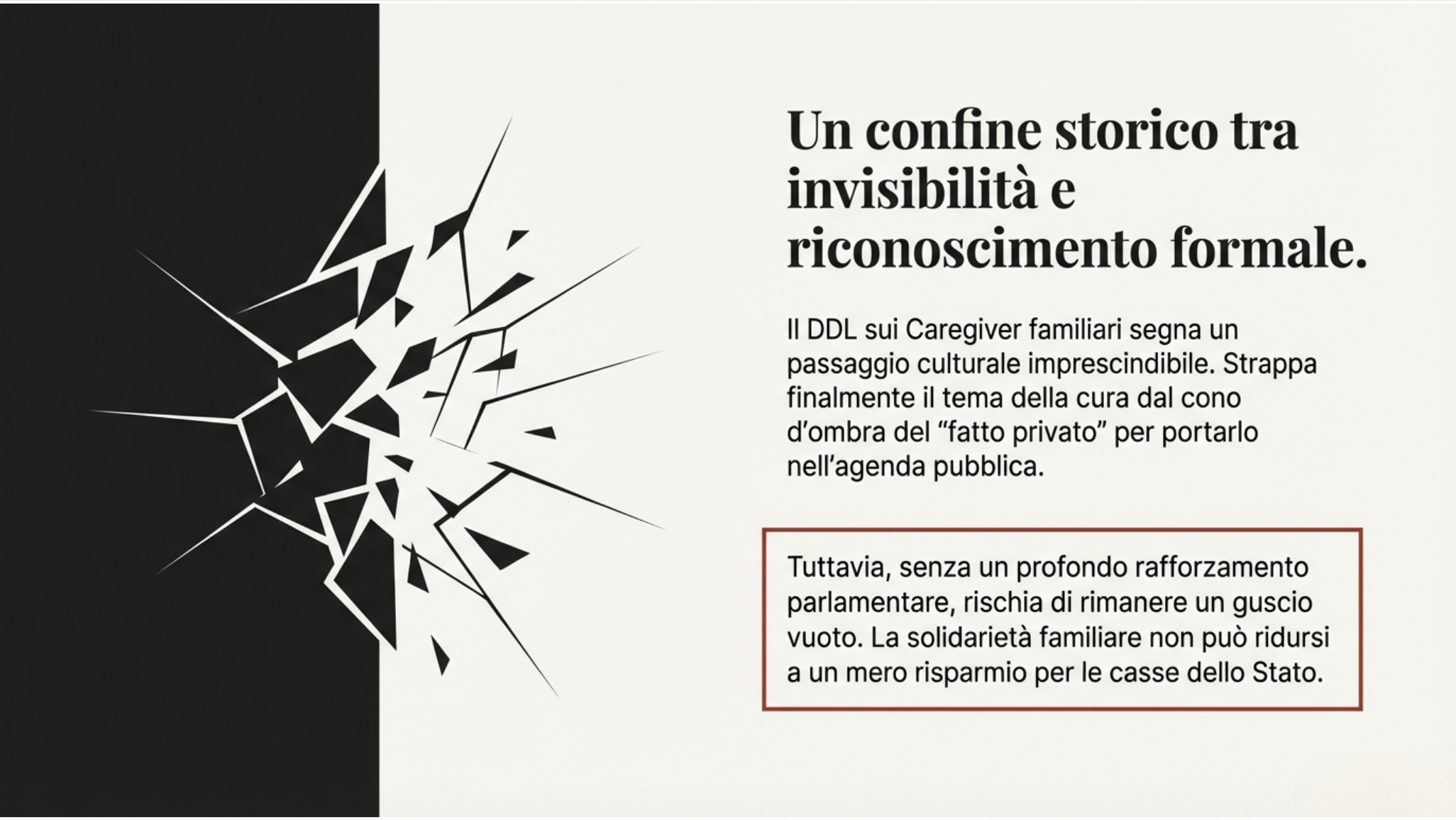 Il Disegno di Legge sui caregiver familiari, approvato dal Consiglio dei Ministri su iniziativa della Ministra Locatelli, rappresenta un passaggio storico: per la prima volta la cura familiare esce dall’invisibilità e viene riconosciuta nell’agenda pubblica. Tuttavia, senza un rafforzamento significativo durante l’iter parlamentare, il provvedimento rischia di rimanere una risposta minima a un’emergenza sociale che coinvolge milioni di cittadini.