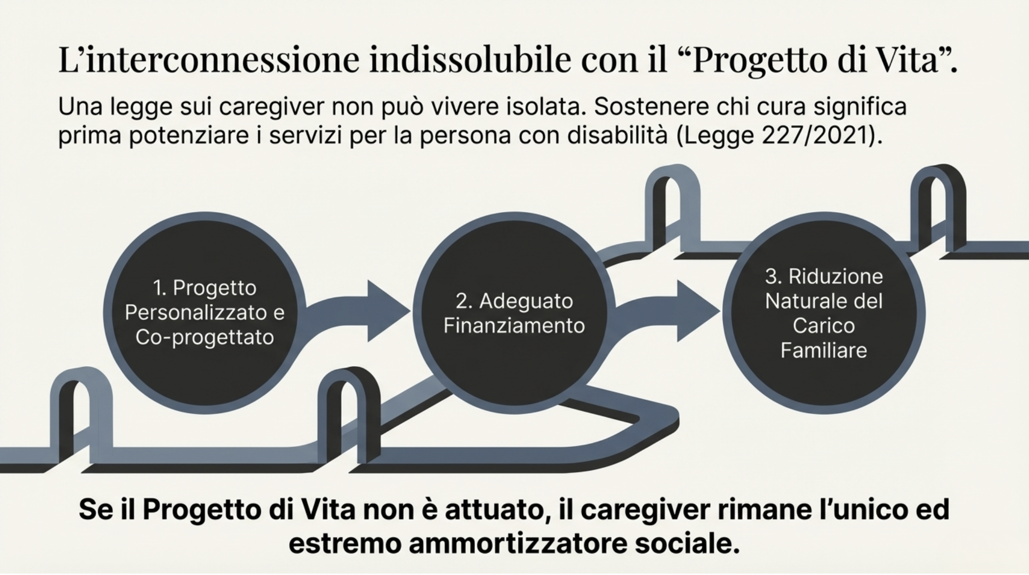 Una legge efficace sui caregiver deve essere strettamente collegata alla riforma della disabilità e al Progetto di Vita previsto dal Decreto 62/24: solo rafforzando i servizi e i percorsi personalizzati per le persone con disabilità si riduce realmente il carico sulle famiglie.
